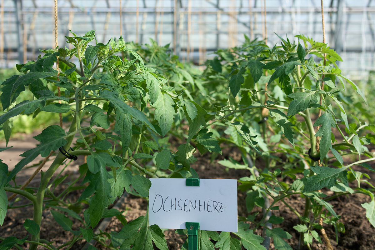 Unsere beiden grossen Gewächshäuser heizen wir nicht, das spart wertvolle Energie. Wir arbeiten mit zugekauften Nützlingen (z.B. Schlupfwespen, Schwebfliegen und Raubmilben), die Blattläuse, Spinnmilben und Co. auf natürliche Weise in Schach halten. Tröpfchenbewässerung und Bodenbedeckung bei den Sommerkulturen sparen Wasser, das in den Gewächshäusern mehrheitlich aus unseren Regenwasserbecken stammt. Im Freiland bewässern wir wenn notwendig massvoll.
